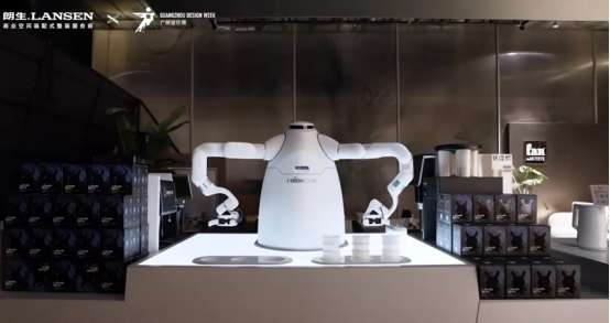 这次展会上亮相的OrangeStar机器人咖啡,就是产业共生的鲜活案例。作为聚焦年轻群体的新锐科技咖啡品牌,该咖啡机器人内置全球140多位大师的冲泡手法,主打“科技赋能咖啡体验”。朗生用定制板材还原金属质感的异形吧台,材料防火防水,搭配无钉无胶快装结构与磁吸层板,所有部件工厂预制、现场快速拼接。即使是吧台复杂的异形曲面与转角,也通过高精度的模块化设计和定制收口方案,实现了严丝合缝的过渡,确保了整体视觉的纯粹性与科技感。最终朗生让科技调性精准转化成为空间语言。